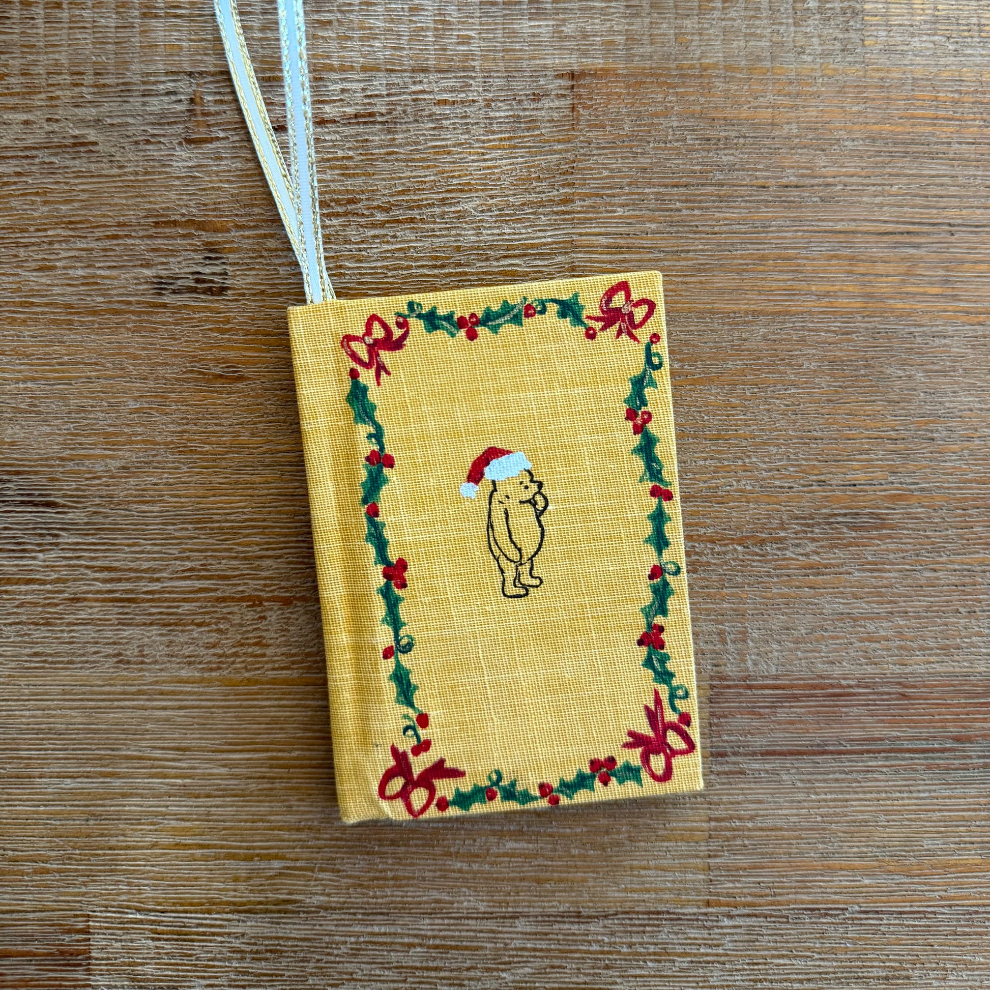 This adorable ornament is hand painted with a Christmas motif featuring festive bows, mistletoe with a little gold touch, and a Santa hat added to the original Pooh image. These ornaments are fully functional watercolor journals and will look beautiful on your tree!